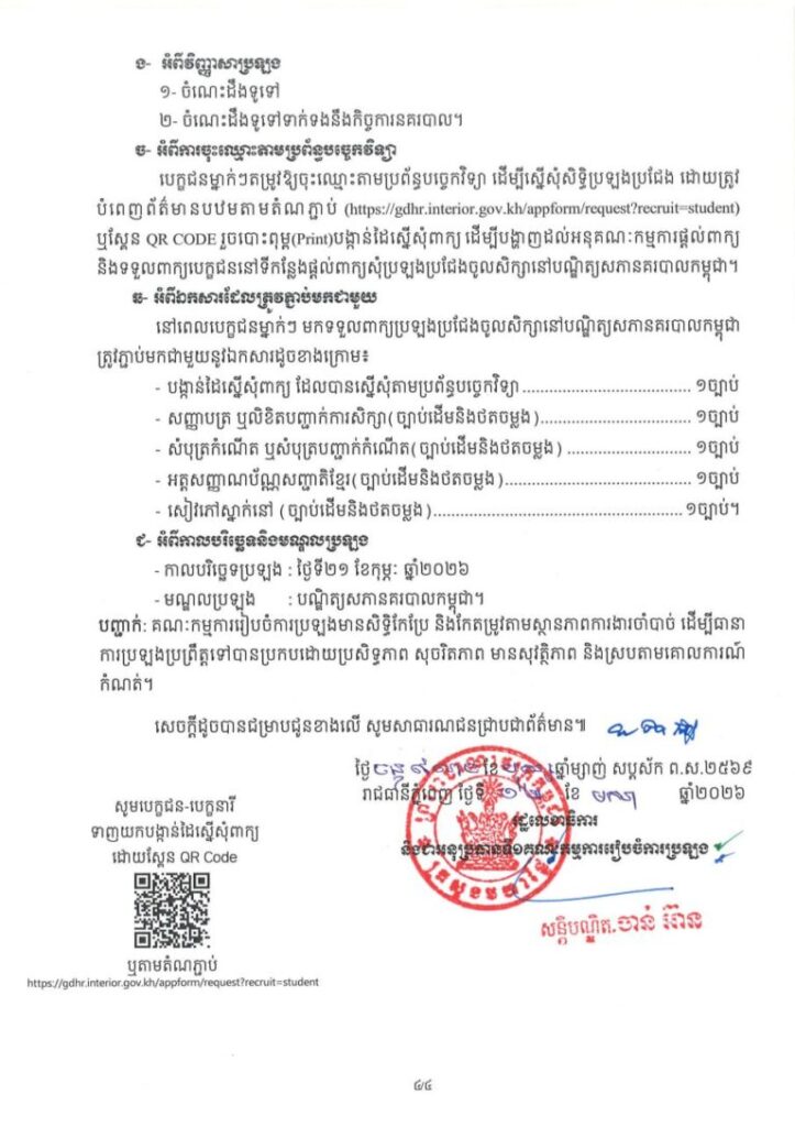 ក្រសួងមហាផ្ទៃ ប្រកាសប្រឡងប្រជែងជ្រើសរើសនិស្សិត និងសិស្សនគរបាលអាហារូបករណ៍ប្រចាំឆ្នាំ នៅបណ្ឌិត្យសភានគរបាលកម្ពុជា