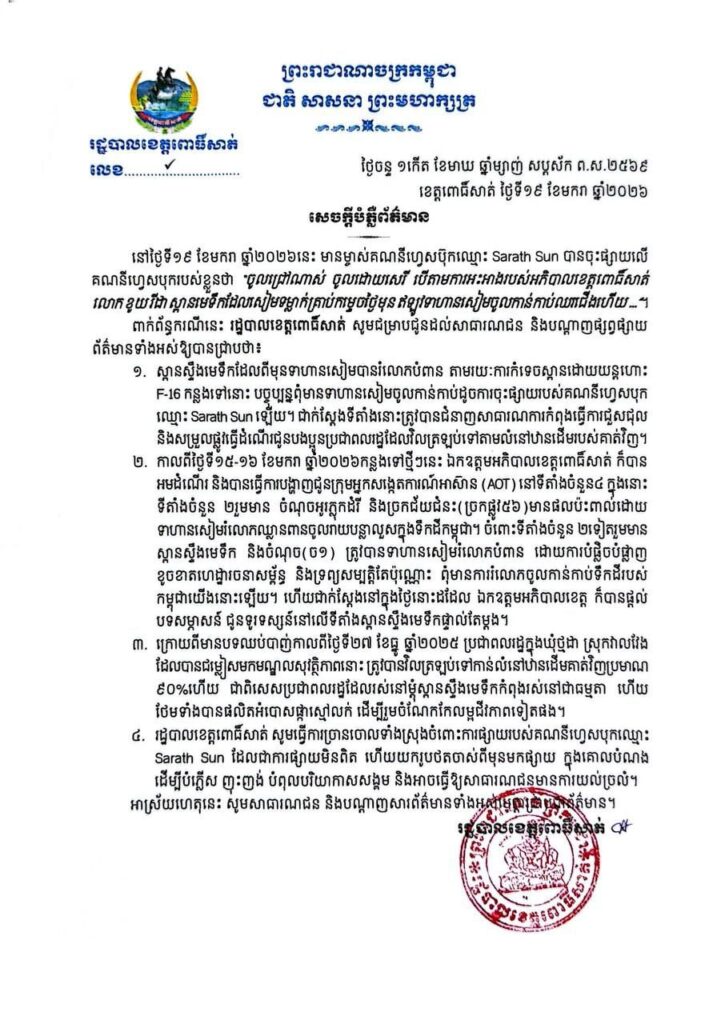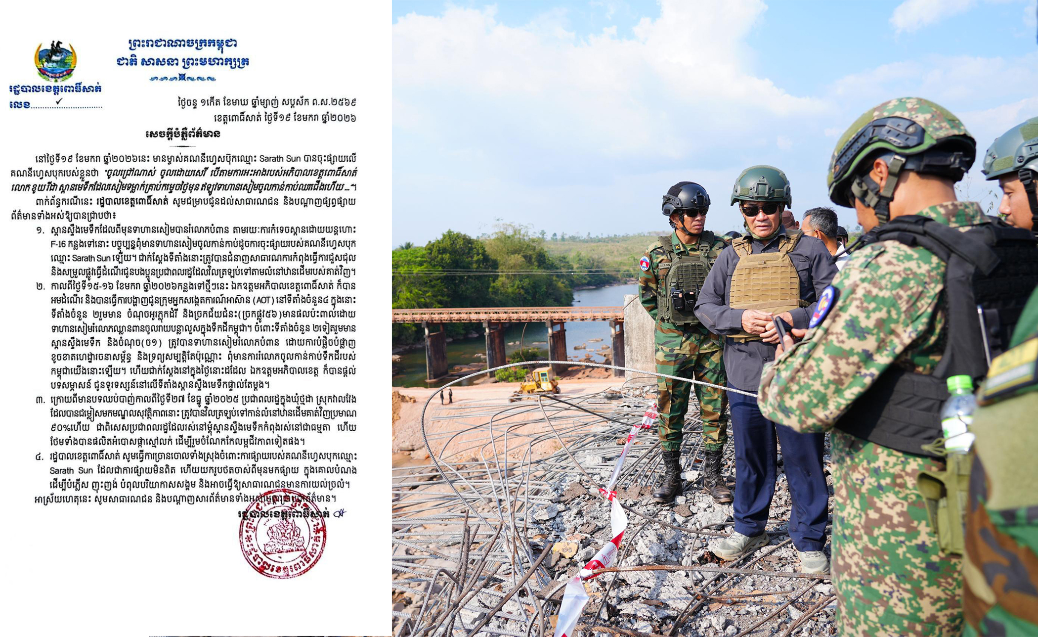 ក្នុងសេចក្តីបំភ្លឺព័ត៌មានរបស់រដ្ឋបាលខេត្តពោធិ៍សាត់ បានសរសេររៀបរាប់ថា នៅថ្ងៃទី១៩ ខែមករា ឆ្នាំ២០២៦នេះ មានម្ចាស់គណនីហ្វេសប៊ុកឈ្មោះ Sarath Sun បានចុះផ្សាយលើ គណនីហ្វេសបុករបស់ខ្លួនថា “ចូលជ្រៅណាស់ ចូលដោយសេរី បើតាមការអះអាងរបស់អភិបាលខេត្តពោធិ៍សាត់ ឯកឧត្តម ខូយ រីដា ស្ពានមេទឹកដែលសៀមទម្លាក់គ្រាប់កម្ទេចថ្ងៃមុន ឥឡូវទាហានសៀមចូលកាន់កាប់ឈរជើងហើយ…។