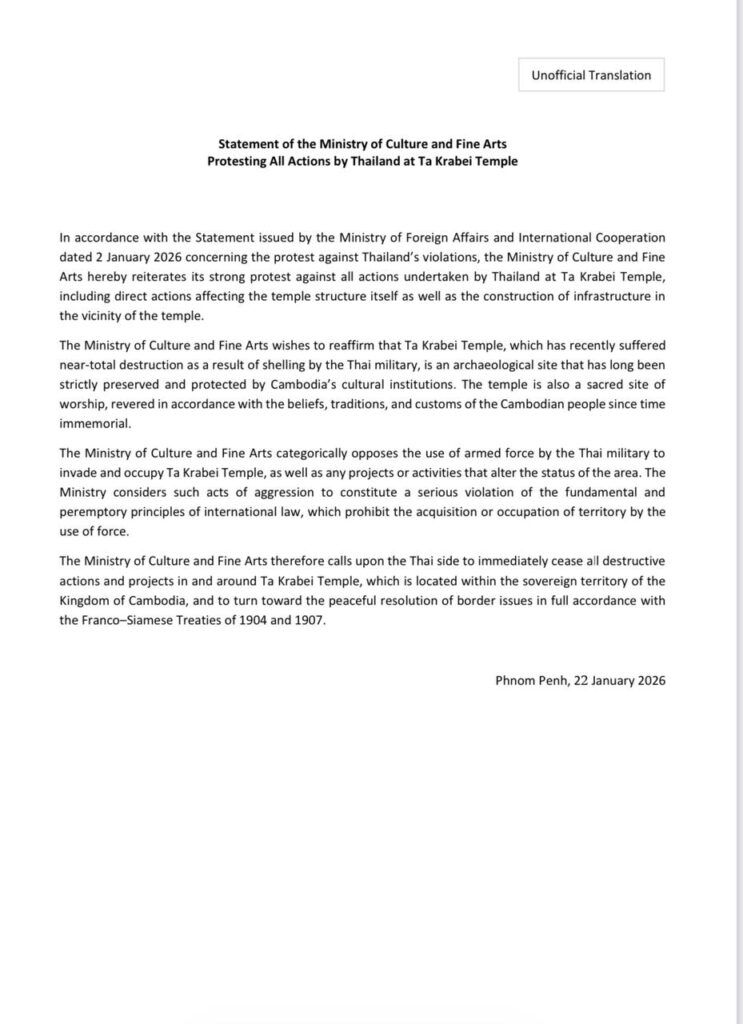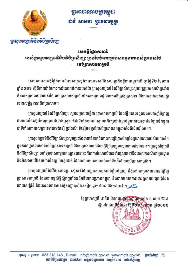 ភ្នំពេញ ៖ ស្របតាមសេចក្តីថ្លែងការណ៍ របស់ក្រសួងការបរទេស និងសហប្រតិបត្តិការអន្តរជាតិ ចុះថ្ងៃទី២ ខែមករា ឆ្នាំ២០២៦ ស្តីពីការតវ៉ា ចំពោះការរំលោភបំពានរបស់ថៃ, ក្រសួងវប្បធម៌ និងវិចិត្រសិល្បៈ បានបន្តប្រកាសតវ៉ាប្រឆាំង នឹងសកម្មភាពនានារបស់ថៃ នៅប្រាសាទតាក្របី ទាំងសកម្មភាពផ្ទាល់មកលើប្រាង្គប្រាសាទ និងការសាងសង់ហេដ្ឋា រចនាសម្ព័ន្ធនានាជិតប្រាសាទ។