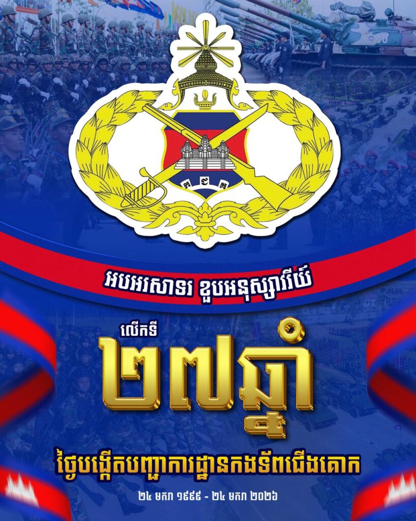 ភ្នំពេញ៖ សម្តេចបវរធិបតី ហ៊ុន ម៉ាណែត នាយករដ្ឋមន្ត្រីនៃកម្ពុជា នៅព្រឹកថ្ងៃទី២៤ ខែមករា ឆ្នាំ២០២៦នេះ បានបង្ហោះសារអបអរសាទរ ខួបអនុស្សាវរីយ៍លើកទី ២៧ឆ្នាំ ថ្ងៃបង្កើតបញ្ជាការដ្ឋានកងទ័ពជើងគោក (២៤ មករា ១៩៩៩ ~ ២៤ មករា ២០២៦)។