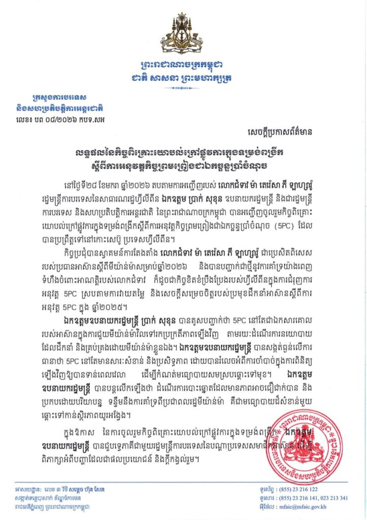 ឧបនាយករដ្ឋមន្ត្រី ប្រាក់ សុខុន បានគូសបញ្ជាក់ថា 5PC នៅតែជាឯកសារគោល របស់អាស៊ានក្នុងការជួយមីយ៉ាន់ម៉ាវិលទៅរកប្រក្រតីភាពឡើងវិញ តាមរយៈដំណើរការនយោបាយ ដែលដឹកនាំ និងគ្រប់គ្រងដោយមីយ៉ាន់ម៉ាខ្លួនឯង។
