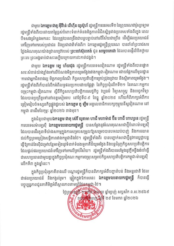 រដ្ឋមន្ត្រីទាំងពីរ បានបញ្ជាក់សាជាថ្មីនូវការប្តេជ្ញាបន្ត ធ្វើឱ្យកាន់តែស៊ីជម្រៅបន្ថែមទៀតនូវទំនាក់ទំនងទ្វេភាគីដ៏យូរអង្វែង និងបន្តជំរុញកិច្ចសហប្រតិបត្តិការ ដែលផ្តល់ផលប្រយោជន៍ទៅវិញទៅមកលើគ្រប់វិស័យ។ រដ្ឋមន្ត្រីទាំងពីរបានសម្តែងនូវក្តីទន្ទឹងរង់ចាំធ្វើ ជាសហប្រធានជាមួយគ្នាក្នុងកិច្ចប្រជុំគណៈកម្មការចម្រុះសម្រាប់កិច្ចសហប្រតិបត្តិការកម្ពុជា-ម៉ាឡេស៊ី លើកទី៣ ក្នុងឆ្នាំនេះ។
